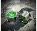 12mm round for a 1/2-inch plug, vintage Green Uranium/vaseline glass stones, and Internally threaded Screw backs for ease of placement.