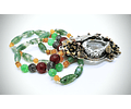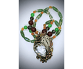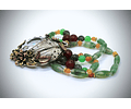 One of my favorite mixed metal pieces that I've created. I used a rough mix of molten brass and copper to cast the flowers and leaves I used. I really like how each piece isn't one solid color, it's a swirl of both metals. I used .900 silver for the filigree work and I rolled an old US 900 silver coin for the back plate. The bezel around the 18.7ct optically clear quartz stone is 925 sterling. The beads I used are all old stock from the early 90s and are - moss agate, jade, chrysoprase, black terminated quartz, carnelian, and peachy aventurine. Very, very earthy tones. The entire piece hangs from hand-knotted German silk with sterling silver/vermiel spacer beads.