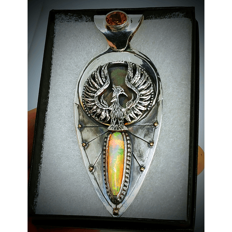 Hand fabricated from hand rolled sterling silver. Hand engraved and carved, African fire opal and sunset scapolite with 14k accents.