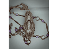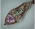 The green diamonds adorning the piece were salvaged from a ring that could not be worn due to its size and design. The chain itself comprises segments of an antique 14k white-gold watch chain, meticulously modified to suit this unique creation. The back of the piece showcases my own filigree work alongside elements from an antique filigree brooch.