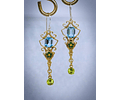 Hand fabricated from vintage brass findings and hand soldered to their desired shape, these vintage-inspired earrings feature 5ct of Old stock, 8x6mm Sky blue topaz emerald cut stones, genuine peridot-5mm, as well as torch-fired glass enamels. Carefully hung from sterling silver ear wires.